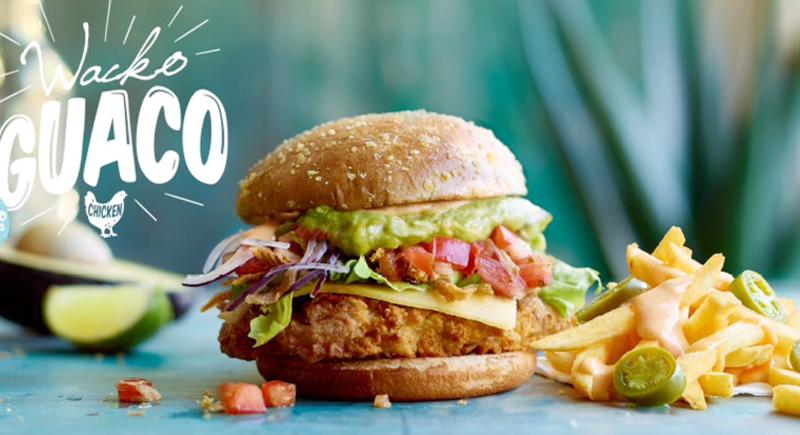 Wacko Guaco focuses on fresh toppings, including cheddar, lettuce, guacamole, pico de gallo, and crispy onions. It started with a chicken version, but is now available with beef or vegetarian patties.